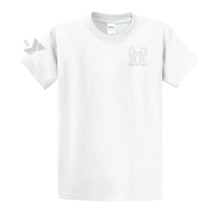 White tee with white Camp St. Croix print on left chest and white Y logo on sleeve.